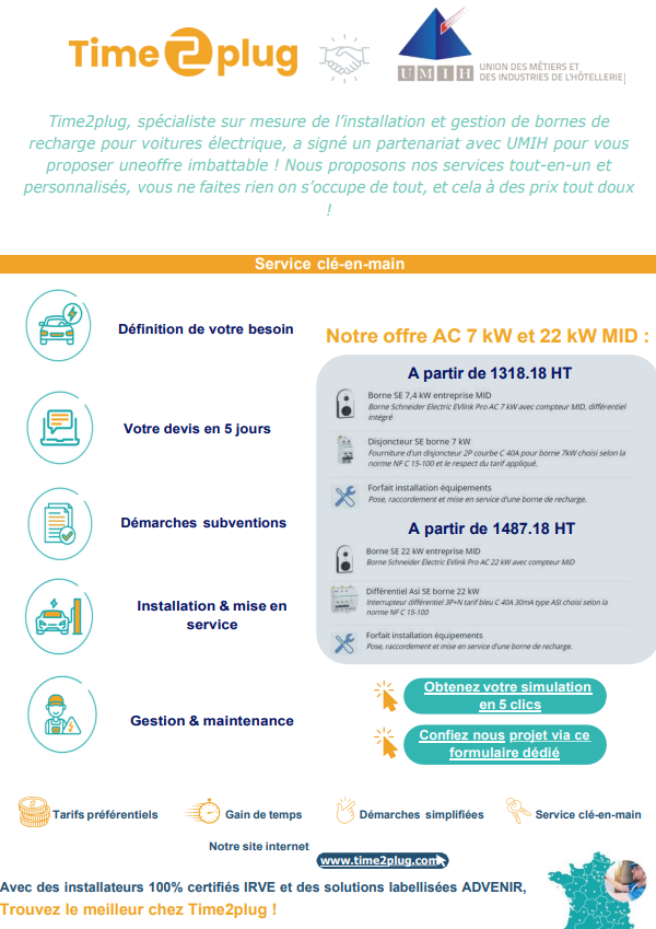 Time2plug, spécialiste sur mesure de l’installation et gestion de bornes de recharge pour voitures électrique, a signé un partenariat avec UMIH pour vous proposer une offre imbattable ! Nous proposons nos services tout-en-un et personnalisés, vous ne faites rien on s’occupe de tout, et cela à des prix tout doux !